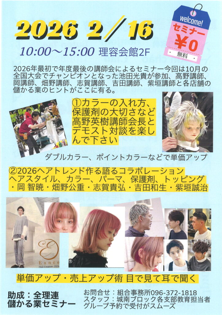 令和8年2月16日(月)10:00より熊本理容会館にてセミナー講習会を開催いたします。